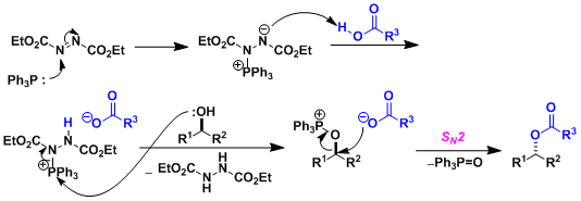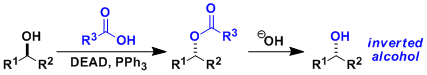 第二級アルコールにアゾジカルボン酸ジエチル(DEAD)、トリフェニルホスフィン(Ph3P)、安息香酸を反応させると、立体反転(SN2経路)を伴って、対応するベンゾイルオキシ誘導体が生成する。続くアルカリ加水分解により、対応するアルコールに変換できる。すなわち、アルコールの立体反転法として用いられる。