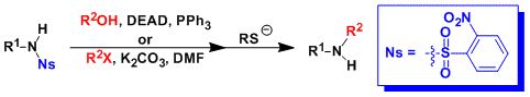 トルエンスルホニル(Ts)アミドなどでも同様の変換に伏すことは可能だが、Ns基の場合はチオールの求核攻撃によって容易に脱保護が行える。この点で脱保護の難しいTs基よりも優れる。