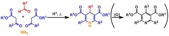 β-ケトエステルとアルデヒドにアンモニアを作用させると、ジヒドロピリジンが得られる。これは引き続く酸化により対称型多置換ピリジンへと変換できる。エステル部は加水分解ののち脱炭酸によって除去することも可能。