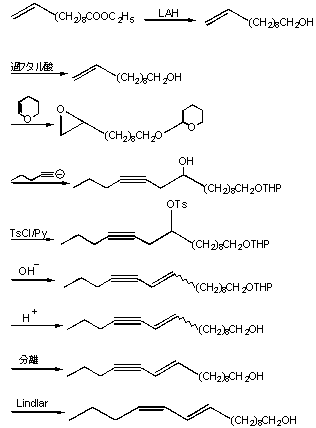 まず、ボンビコールの構造上の特徴を見てみる。骨格としては16個の直鎖状の炭素鎖を持っているが、この内C1−C9までは飽和基である。また、官能基の特徴としては、10,12位にそれぞれtrans−およびcis-の二重結合を、そして、1位に一級アルコールを有している。