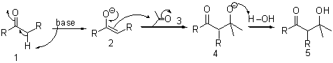 第一段階で化合物1のα位のプロトンが引き抜かれ化合物2となる。この化合物2の酸素−炭素結合がもう一度二重結合となりケトン3のカルボニル炭素に求核攻撃し化合物3となった後に酸素アニオンが水の水素を取りアルコールとなる。