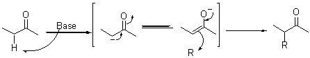 カルボニル基のα位の水素の酸性度は高い(pKa=19〜20)。これは中間体は共鳴安定化することが出来るためである。そのため塩基を用いると容易にプロトン引き抜きが進行し図6に示す中間体を経て反応が進行する。