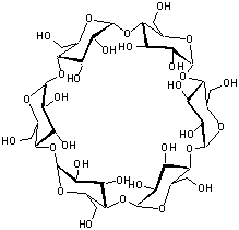 図1 a-CDの構造 CDの最も重要な特性は空洞に種々のゲストを取り込み、包接化合物を形成することである。包摂化合物の形成にはゲスト化合物とホスト化合物(CD)とのvan der Waals力並びにゲスト化合物とCDのヒドロキシル基との水素結合が機能していると考えられている。 工業的規模でのCDの生産は1980年代になって日本で開始された。現在、工業的規模で1年間に世界中で2000トン以上のCDが生産されている。