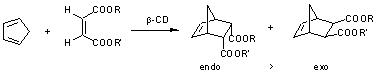 簡単な例をあげるとDiels-Alder反応(図3)においてエンド/エキソの選択性には反応溶媒依存性があり、水中で反応を行うことによりエンドの選択性が増すことはご存知であろう。これにβ-CDを添加するとさらにエンド選択性が増す。