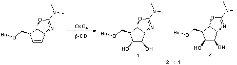 また、図4のように四酸化オスミニウムとの反応によりシスジオールを得ることが、2種類出来てしまい、THF-水3:1の溶媒中で反応を行うと1:4.6の比率で2が生成する。この比率を逆転させることは難しかったが、β-CDと包接錯体を形成させると2:1の比率で化合物1を主生成物として得ることができた。これはCDがO-Bn基を取り囲み有効な立体障害因子として作用したためである。(J.Molecular Catlysis,70,399,1991) 図4OsO4酸化(シクロデキストリン添加)