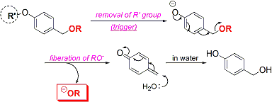 このプロドラッグは、1,4-キノンメチド開裂反応を上手く使用した設計となっています。スキームを<図3>に示します。まずフェノールの保護基R'が何かしらの条件で除去されることで反応が開始します。その後、フェノキシドのベンジル位からアルコキシドRO-が開裂し、キノンメチドを生成します。キノンメチドは不安定なので水が介在しているときには速やかに反応してフェノールになります。