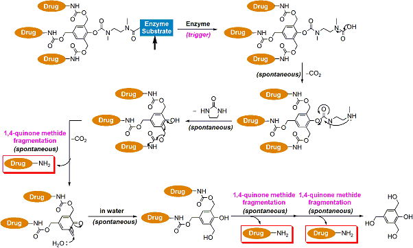 <図1>に示したプロドラッグの薬物放出機構は余分なリンカーがくっついている分少々複雑ですが、最初に基質が酵素によって分解された後は、生理条件下で1,4-キノンメチド開裂を3回繰り返し、3分子の活性型薬物が放出される、というわけです<図4>[1,2]。