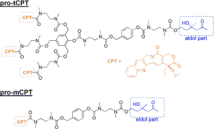 以上のコンセプトに基づき、Shabat教授らは実際に<図5>に示すような3分子のカンプトテシン(CPT: 抗癌剤)と抗体触媒38C2(酵素のモデル)の基質となるアルドール部位を備えたプロドラッグpro-tCPTおよび比較のための単薬剤型プロドラッグpro-mCPTを合成し、細胞成長阻害(端的には抗癌活性)の評価を行いました[1a]。