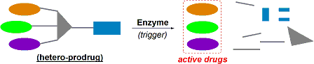 ・ヘテロドラッグ型にすることで複雑な相乗作用をコントロールできる。切断箇所・酵素を変えるなどにより単一薬物が複数の作用部位で時間差作用・相乗作用を及ぼすような薬物設計すら可能になる(参考文献[1c]も参照)。