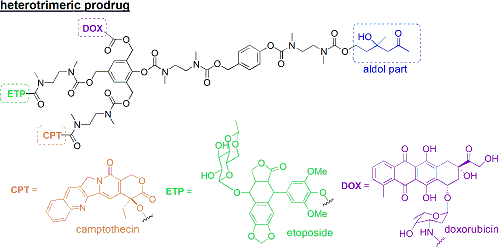 その具体化としてShabat教授らは<図7>のようにカンプトテシン、ドキソルビシン、エトポシドという3種類の抗癌剤を結合させたプロドラッグを合成し、同様の活性評価を行っています[1a]。単純な活性値自体はpro-tCPTにくらべやや落ちるようですが、化学療法における相乗効果が期待できるかもしれない、と付け加えられていました。