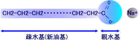 今回重要なのは、界面活性剤である。界面活性剤とは文字どおり界面(例えば水中と空気、気体と液体、水と油)などを活性化するものである。 これは有機物であるが塩であるから、水溶性なのだが、分子が長いため図2のような疎水基(親油基)と親水基をもっている。