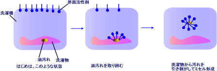洗濯物の入った水中にこの界面活性剤を入れると、初めは親水基は水中に、親油基は水を避けるために空中に存在する。しかし、油汚れを見つけると、疎水基が油を取り囲んで、また親水基の電気的相互作用によりミセルを形成する。そうして取り込まれた汚れは、洗濯物から外れて浮揚する(可溶化)
