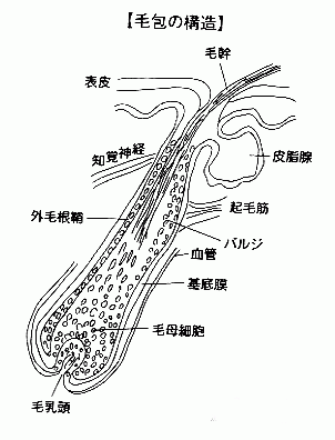 私たちが普段見ている毛髪は右図でいうところの毛幹という部分です。毛幹自体は死んで角質化した細胞で構成されており、全く増殖しません。ではどうして髪は伸びるのでしょうか?。