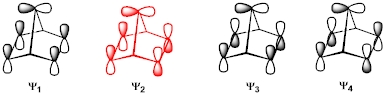 図8. ノルボルナジエンの分子軌道の組み立て さてここでノルボルナジエンの7位にp軌道を導入したことを考えてみたいと思います.Ψ1からΨ4の四つの分子軌道はこのp軌道と相互作用するでしょうか? しないでしょうか?今回は2:2:1の相互作用のパターンですがもう分かりますね?そうです,下の図9の赤で示したように,Ψ2のみが相互作用可能です.これは図5jと同じ考え方に基づいてますね.それ以外のΨ1,Ψ3,Ψ4は軌道の対称性が異なるために相互作用しません.この相互作用もやはりスルースペース相互作用と言えます.実際に7-メチレンノルボルナジエン (4) の分子軌道を考えてみると図10のようになり,Ψ2のみが相互作用している様子がよく分かりますね.