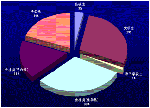 図2は職業別の読者数です。こちらのミスで「大学院生」という項目を入れ忘れました。申し訳ございません。「その他」の大部分は大学院生と思ってもいいのでしょうか。会社員(化学系)の方が大学生より多く、30%でした。会社員の方からはよくご意見、ご感想、励ましのメールをいただくので熱心に読んでいただいていることがわかりました。