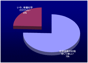 図3が回答結果です。4分の3の方が化学全般のお話を希望しています。しかし有機化学だけでよいというかたもかなりいるので、どうしようか考えたところ、化学全般のお話を4回に1度ほど混ぜることにしました。