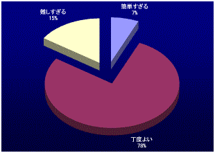 図4が回答結果です。丁度よいという方が大半を占めましたが簡単すぎる、難しすぎるという方も両方で4分の1近くいました。