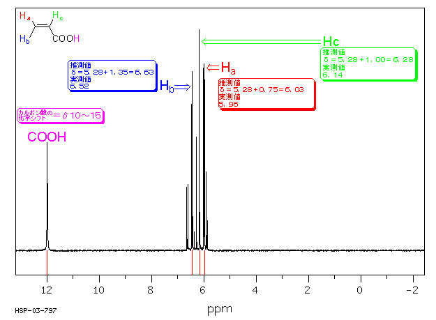 図3はアクリル酸の1H NMRスペクトルである。アクリル酸にはオレフィンに直結した比等価な水素3つとカルボン酸の水素が存在する。カルボン酸の水素は前項の酢酸でも述べたようにδ10〜15に吸収線が現れる。オレフィンに直結した水素は式(1)より、赤、青、緑の枠中に示した値になり、実測値と比較し図中の位置に吸収線が現れえることがわかる。δ6付近に現れている弱い吸収線はオレフィンに直結した非等価な水素同士のカップリングによるものである。