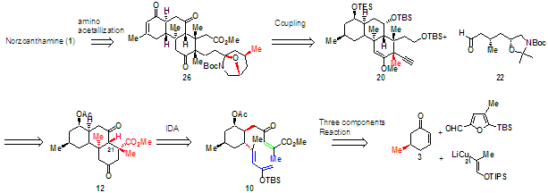 それでは、最近の論文から〜ノルゾアンタミンの全合成1〜に続いて実際のノルゾアンタミンの合成について説明していきましょう。まずは、ノルゾアンタミンの逆合成解析から(Scheme 1)。