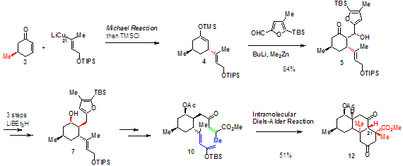 (R)-5-メチルシクロヘキセノン3を出発物質とし3成分連結反応を試みました。すなわち、ビニル銅試薬の立体選択的Michael反応、多置換フラルアルデヒドとのアルドール反応を行い、1:1のジアステレオマーとして5を合成しました。3段階を経て3置換シクロヘキサノンを立体選択的に構築した後、LiBEt3Hを作用させβアルコール7を単一のジアステレオマーとして得ています。
