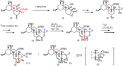 まず12のケトンを立体選択的に還元し、ラクトン13に変換しました。