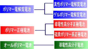 一言にポリマー電池といってもポリマー電池も使われる材料によって多種多様である。普通(元来)の電池は正極が金属酸化物、負極が金属、電解質が水溶液あるいは有機溶媒でした。これらの正極、負極、電解質のどれか一つまたはすべてにポリマーを使用している電池をポリマー電池という。また、どこに使われるかによって大きく図1のように分類される。ポリマーのような高分子材料を代わりに使うことによって、電池の薄型軽量化が期待できる。