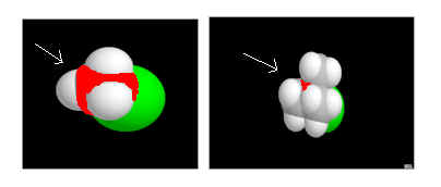例えば図1のようなハロゲン化アルキルのSN2反応の場合、反応点の近くにかさ高い置換基を導入すると、反応速度が著しく低下する。(表1)脱離基に対して背面からの攻撃の際、置換基と試薬の間に大きなぶつかり合いを生じるからである。3次元モデルで見てみるとそれがよくわかる。(図2)反応点が置換基の少ない方(左)より置換基の多いほう(右)が置換基に阻まれて小さくなっている。