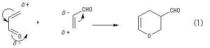 それでは、例としてアクロレインのDiels-Alder反応 による二量化反応を考えてみよう。 電子論で考えると、アクロレインではカルボニル基が電子吸引性のため、これを電子の偏りから考えると式(1)のように予想される。