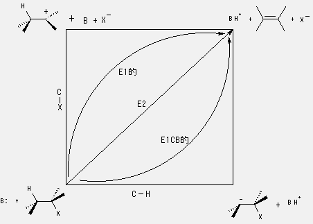 1、X-の脱離能が大きくC-X結合が切れやすくC-H結合が切れにくい。→E1反応 2、X-の脱離能が小さくC-X結合が切れにくくC-H結合が切れやすい。→E1cB反応 3、1、2の中間である。→E2反応