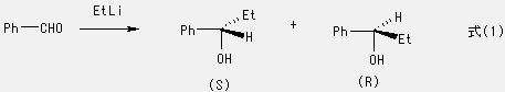 いま、アルデヒドとして、ベンズアルデヒド(Ph-CHO)のようにもともと不斉中心がないものを用いて、エチルリチウムと反応させると、新たに生じる不斉炭素は式(1)のようにR配置とS配置のものが等量でき、生成物全体は