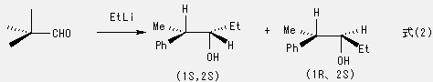 しかし、アルデヒドがもともと不斉炭素を持つもの(例えばMePhCHCHOのようなもの)を持つ場合、式(2)のように生成物は互いにジアステレオマーの関係になる。