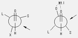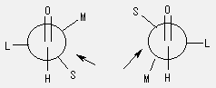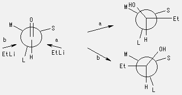 1、不斉炭素のついている3つの基をL、M、Sとしてあらわす。(L>M>S) 2、一番大きなLをアルデヒド基の酸素から一番遠くに書く。(アルデヒド基の酸素と立体的に反発し、双方ができるだけ遠くなるようなコンフォメーションをとっていると仮定。) 3、エチルリチウムを近づけてみる。