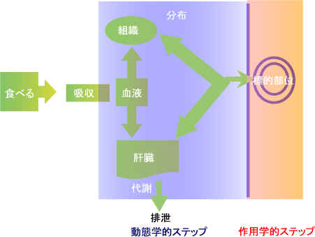 というわけで、毒がその作用を繰り広げるためには、それぞれに用意された場所に行く必要があるわけです。 これらの場所を標的部位と呼びます。また摂取された物質がその標的部位に到達するまでの段階を動態学的なステップと呼ばれています。