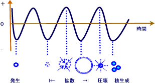 化学反応を引き起こす過程は小さい気泡の挙動によると考えられる。それらは図2のように生成・圧壊する。この圧壊によって発生する圧力と温度はきわめて大きい。この過程は”過度的キャビテーション”と呼ばれ、目に見える化学的効果は直接この現象に起因する。 超音波の化学作用を、このようなキャビテーションが圧壊するときに生じる”ホットスポット”での熱分解に帰す説(ホットスポット説)が1950年に提唱され、これが一般的に受け入れられるようになってきているが、他にも多数説がある。
