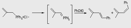 通常のWittig反応での共役ジエンの収率を大幅に改善するために超音波が使用できることを示した。 原料のホスホニウム塩のn-BuLiによる脱プロトン化は非常に遅く、ベンズアルデヒドPhCHOとの反応では収率はわずか8%。LDAを用いると収率はずっと高くなる(79%)。この反応はホスホニウム塩がTHFに溶けにくいことがWittig試薬の生成にとって主要な障壁となっている。そこで、最初の反応を超音波照射下で行ってみたところ、リンイリドの生成は1時間で完結した。これにベンズアルデヒドを加えるとなんと91%の収率で生成物を与えた。
