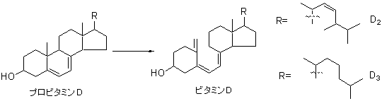 ビタミンD群にはビタミンD2とビタミンD3が存在し、それぞれエルゴカルシフェロール、コレカルシフェロールと呼ばれる。ビタミンD2はプロビタミンD2であるエルゴステロールを前駆体として合成され、ビタミンD3はプロビタミンD3であるデヒドロコレステロールかを前駆体として合成される(図3)。プロビタミンD2は植物によって生合成され、プロビタミンD3は動物によって生合成される。