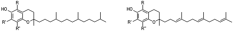 ビタミンE作用を持つ物質にはトコフェロールとトコトリエリトールがあり、どちらも置換基の位置によって4種類の誘導体が存在する(図4)(R=R'=R"=H:トコール、R=R'=R"=Me:α体、R=R"=Me,R'=H:β体、R=H,R'=R"=Me:γ体、R=R'=H,R"=Me:δ体)。