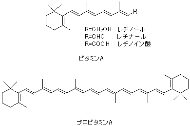 ビタミンAは15位の官能基によりレチノール(アルコール)、レチナール(アルデヒド)、レチノイン酸(カルボン酸)の3種類の構造があり、これらを総称してレチノイドと呼ぶ。